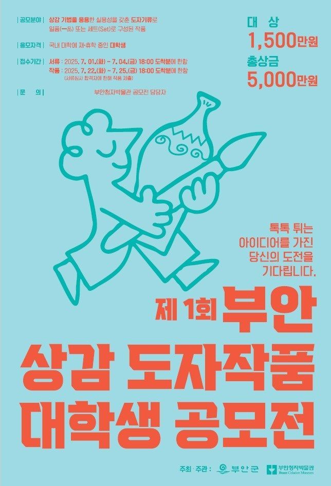 서류 접수는 오는 7월 1~4일이며 1차 서류 심사를 통과한 작품에 한해 2차 실물 심사를 진행한다. 접수된 작품은 전문가의 심사를 거쳐 우수작을 선정하게 되며 수상자에게는 상장과 함께 소정의 상금이 수여되고 수상작은 부안청자박물관 기획전시를 통해 대중에게 공개할 예정이다. 이번 공모전은 전국 최초로 대학생을 대상으로 하는 도자작품 공모전이라는 점에서 더욱 주목받고 있다.