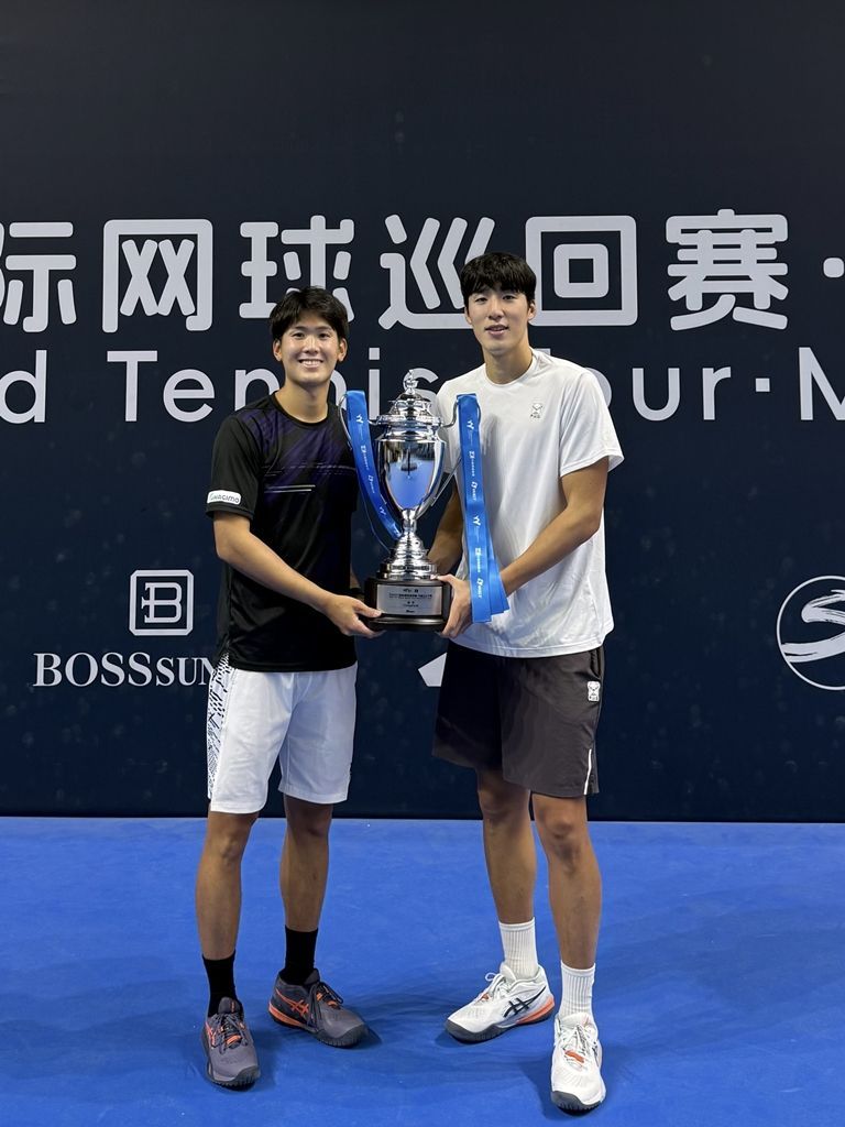 중국 마안산에서 열린 'ITF 마안산 국제투어 대회'에서 남자복식 우승을 차지한 정영석 선수(오른쪽). 의정부시 제공