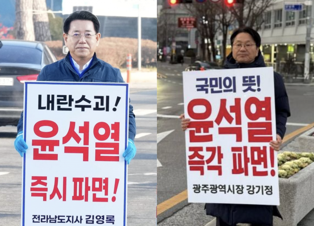 강기정 광주시장과 김영록 전남지사는 각각 5·18민주광장과 전남도청 앞 사거리에서 1인 시위를 벌였으며, 김이강 광주 서구청장은 전날 퇴근길 1인 시위를 진행했다. 문인 광주 북구청장은 청사 외벽에 ‘윤석열 파면’ 현수막을 내걸고 탄핵 인용 때까지 유지하겠다고 밝혔다.