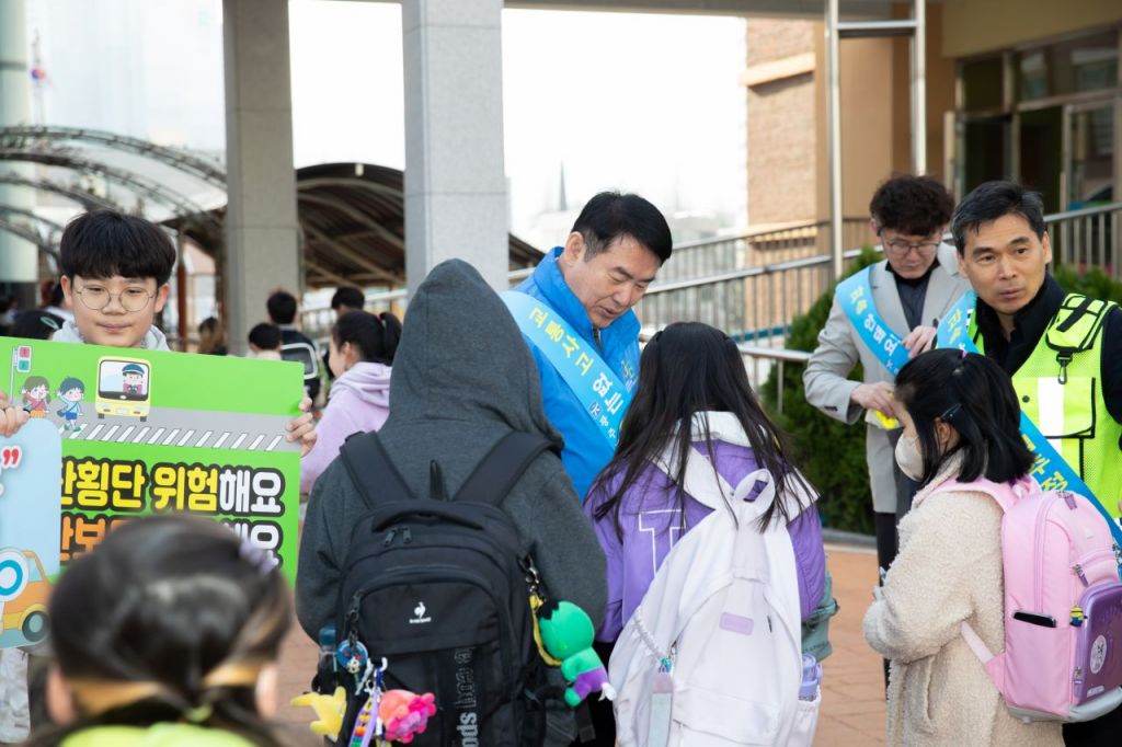 이정선 교육감이 12일 문산초에서 개최된 ‘등굣길 교통안전 캠페인’이 참여하고 있다.
