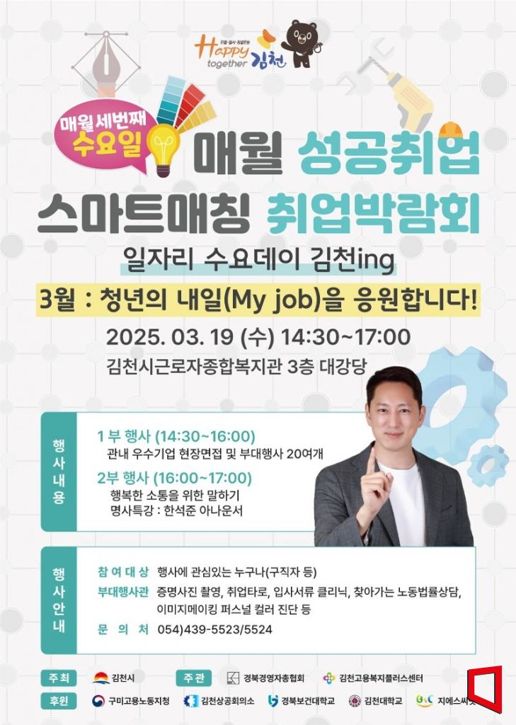 경북 김천시는 오는 19일 김천시근로자종합복지관 3층 대강당에서 '2025 매월성공취업 스마트매칭 취업박람회'를 개최한다고 12일 밝혔다.