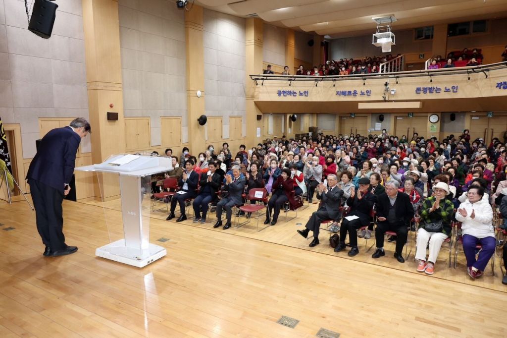 이동환 고양특례시장이 지난 12일 덕양노인종합복지관 2층 대강당에서 열린 덕양노인대학 제33기 신입생 입학식에 참석해 어르신들에게 인사를 드리고 있다. 고양특례시 제공