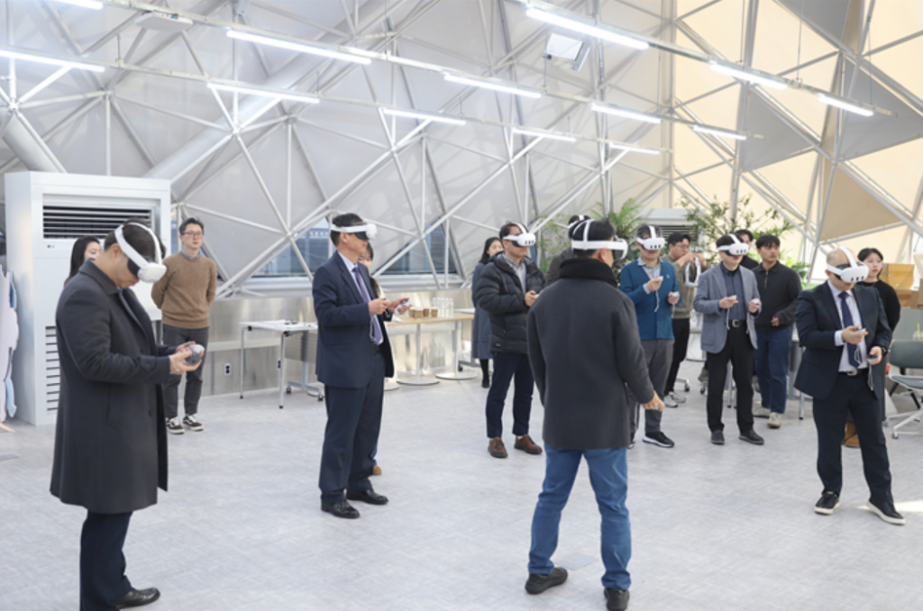 이윤재 숭실대 총장, 장경남 숭실대 학사부총장 등이 지난달 24일 서울 동작구 상도동의 숭실대 신양관 러닝피라미드에서 열린 확장현실(XR)을 활용한 '메타 하이플렉스(META-HyFlex)' 수엽 시연회에 참여하고 있다. 숭실대 제공<br /> <br /> XR을 활용한 '메타 하이플렉스(META-HyFlex)' 수업 시연회를 열었다고 밝혔
