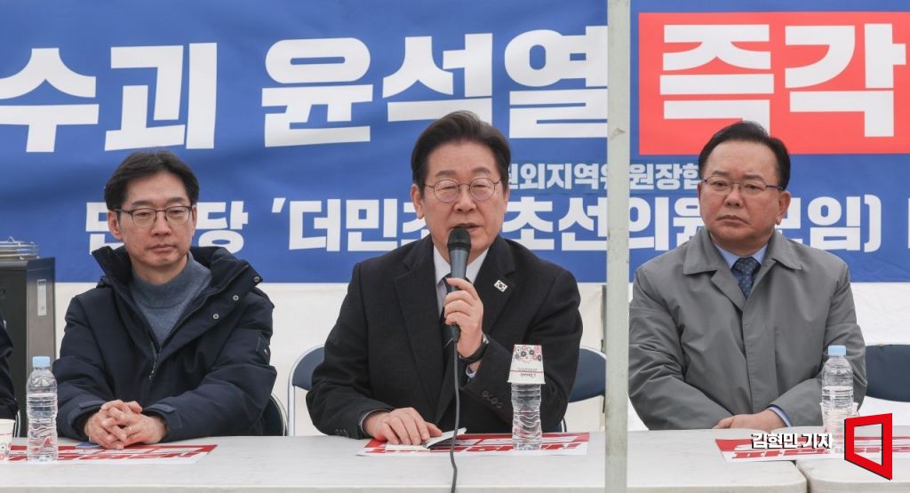 이재명 더불어민주당 대표가 12일 서울 종로구 경복궁 앞 더불어민주당 천막 농성장에서 열린 국난극복을 위한 시국간담회에서 모두발언을 하고 있다. 2025.3.12 김현민 기자