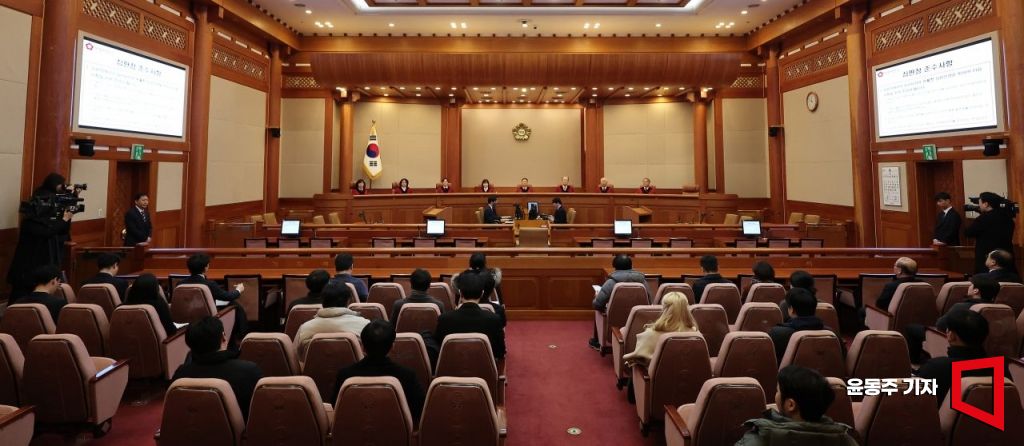 문형배 헌법재판소장 권한대행과 재판관들이 지난달 27일 서울 종로구 헌법재판소에서 열린 마은혁 헌법재판관 후보자의 임명 보류 관련 권한쟁의심판 등 사건에 참석해 자리하고 있다. 윤동주 기자