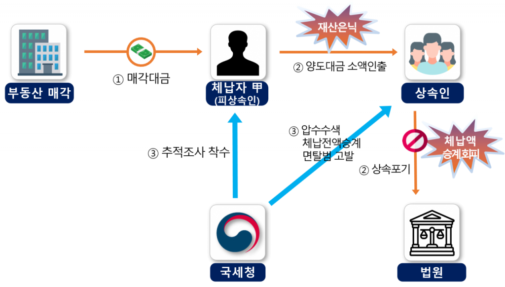 이에 국세청은 피상속인의 예금계좌를 금융 추적해 양도대금이 수백회에 걸쳐 소액 현금 인출되거나 타인의 계좌를 거쳐 현금으로 인출된 사실을 포착했다. 또 양도대금이 인출된 현금인출기 CCTV를 확보해 자녀들이 피상속인의 금융계좌에서 양도대금을 현금으로 인출한 사실을 밝혀낸 후, 자녀들의 주거지에 대한 압수수색 영장을 발부받아 수색을 실시해 현금 등을 압류했다. 이와 함께 민법에 따라 자녀들이 상속을 승인한 것으로 간주해 피상속인의 체납액을 자녀들에게 전액 승계하고, 체납처분 면탈범으로 고발 조치했다.