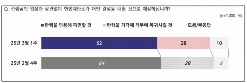 이는 지난주 조사와 비교해 인용·파면 여론인 1%포인트 줄었고, 기각·복귀 여론은 2%포인트 늘어난 것이다. 여론의 향방을 결정하는 중도층(정치성향)의 경우 인용·파면 여론은 67%, 기각·복귀 여론인 25%였다.
