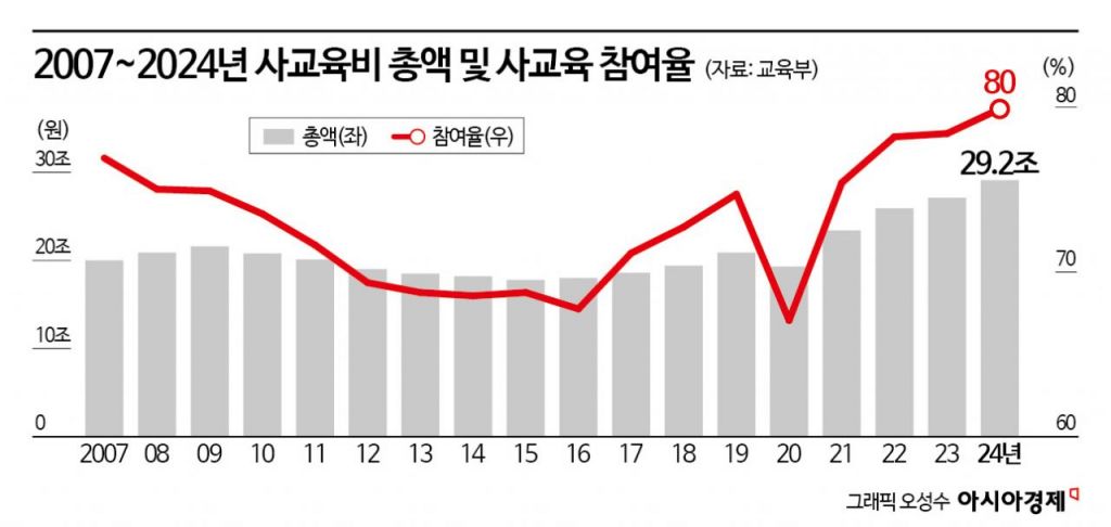 사교육비는 2020년 코로나19로 학원이 문을 닫은 여파 등으로 19조원대까지 내려갔지만, 이듬해인 2021년 23조원대로 껑충 오른 후 4년 연속(23조4000억원→26조원→27조1000억원→29조2000억원) 역대 최고치를 새로 쓰고 있다.