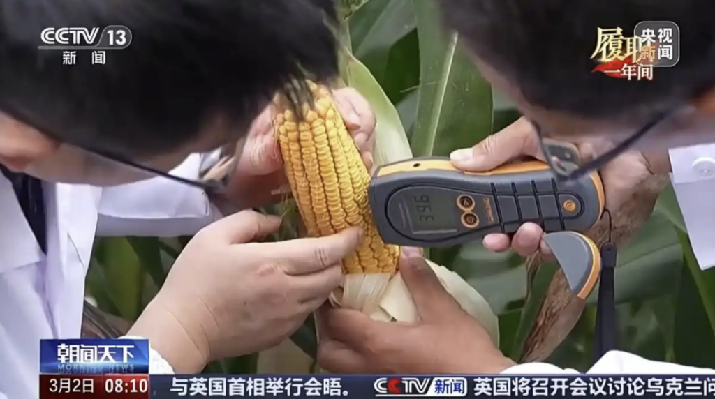 고단백 옥수수 품종에 대해 보도하고 있는 CCTV. CCTV