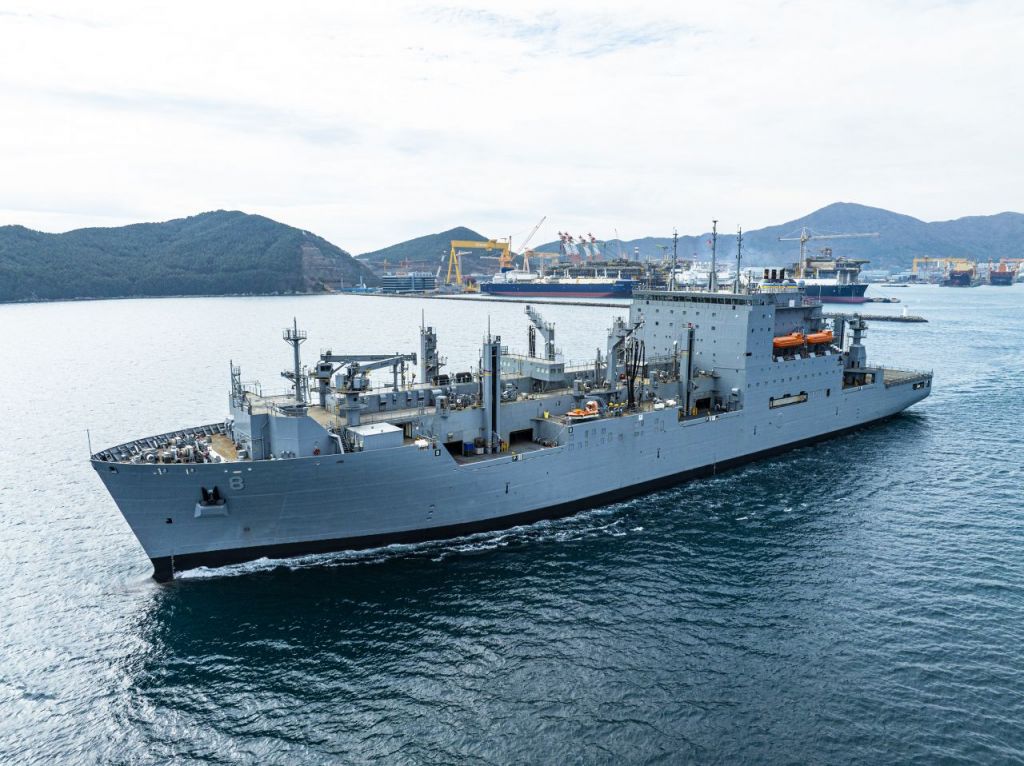 미국 해군 군수지원함인 ‘월리 쉬라’호가 함정 정비를 성공적으로 마치고 출항하고 있다.(사진제공=한화오션)