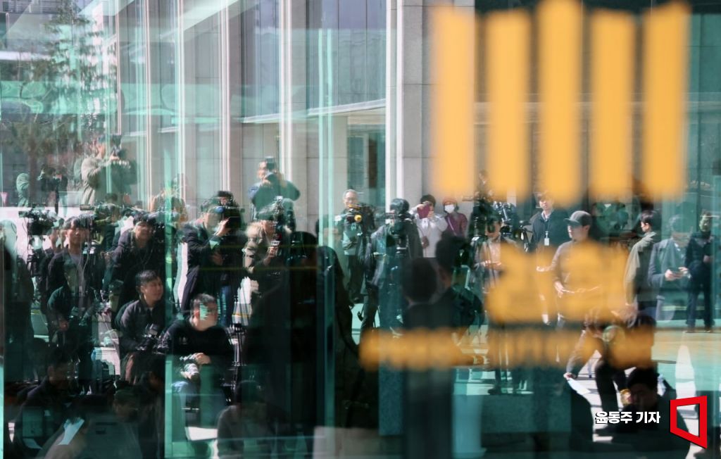 13일 서울 서초구 서울고등법원 청사 유리문에 윤석열 변호인단 기자회견 장면이 반사되고 있다.