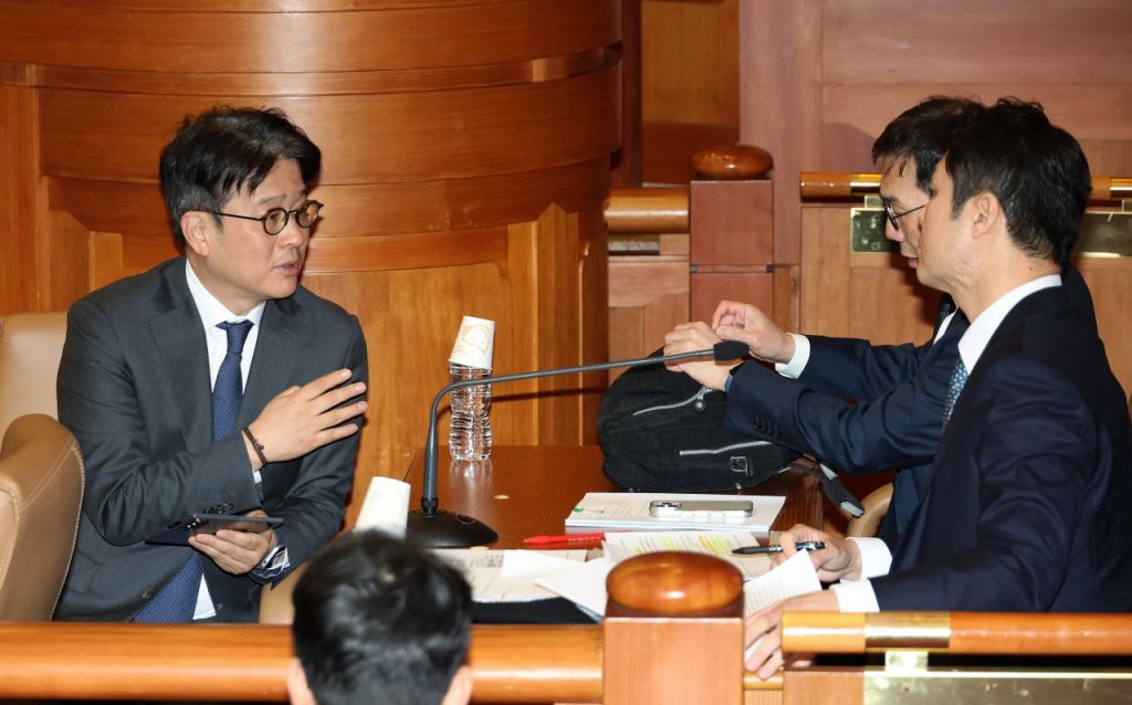 이창수 서울중앙지검장(왼쪽부터), 조상원 중앙지검 4차장, 최재훈 중앙지검 반부패수사2부장이 서울 종로구 헌법재판소에서 열린 검사 3인에 대한 탄핵심판 2차 변론기일에 출석해 대화하고 있다. 연합뉴스