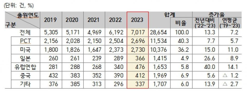 분석 결과에 따르면 2023년 정부 R&D로 창출된 국내 특허출원은 3만7396건으로 전년대비 0.6% 감소했다. 반면 해외 특허출원은 2023년 7017건으로 전년대비 13.3% 증가했다. 2019년~2023년 해외 특허출원 건수는 연평균 7.2% 증가한 것으로 조사된다.