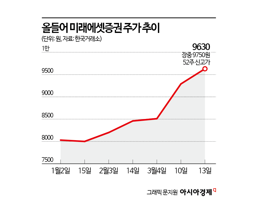 올들어 증권업황 개선 기대감이 커지고 있는 가운데 증권 대장주 미래에셋증권이 주가 1만원을 눈앞에 두고 있다. 거래대금 증가에 우호적인 환경이 기대되는 상황이어서 4년만에 1만원선을 회복할지 주목된다.