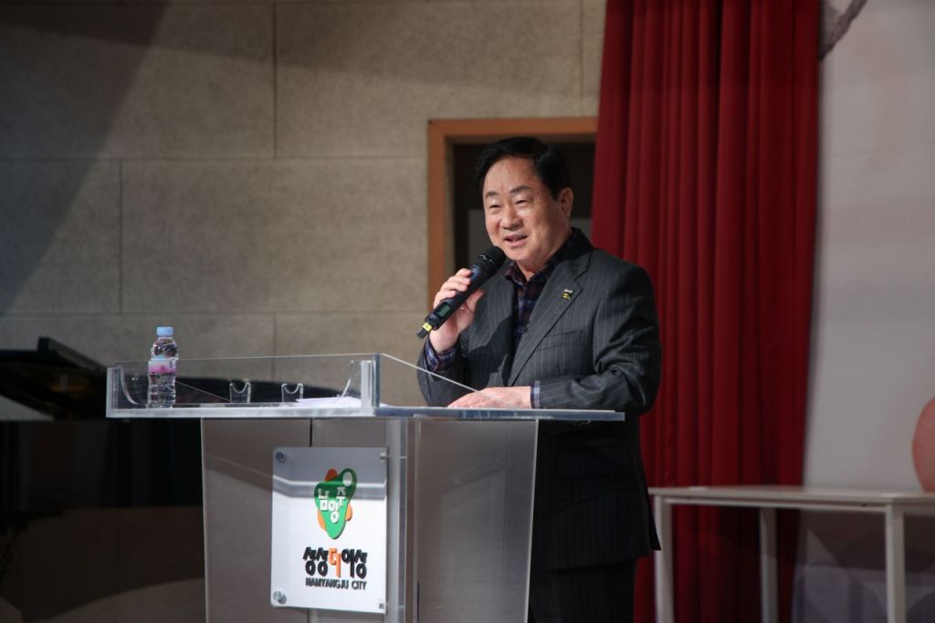 주광덕 남양주시장이 지난 12일 남양주시청 다산홀에서 열린 표준보육과정 보육교사 교육에 참석해 인사말을 하고 있다. 남양주시 제공