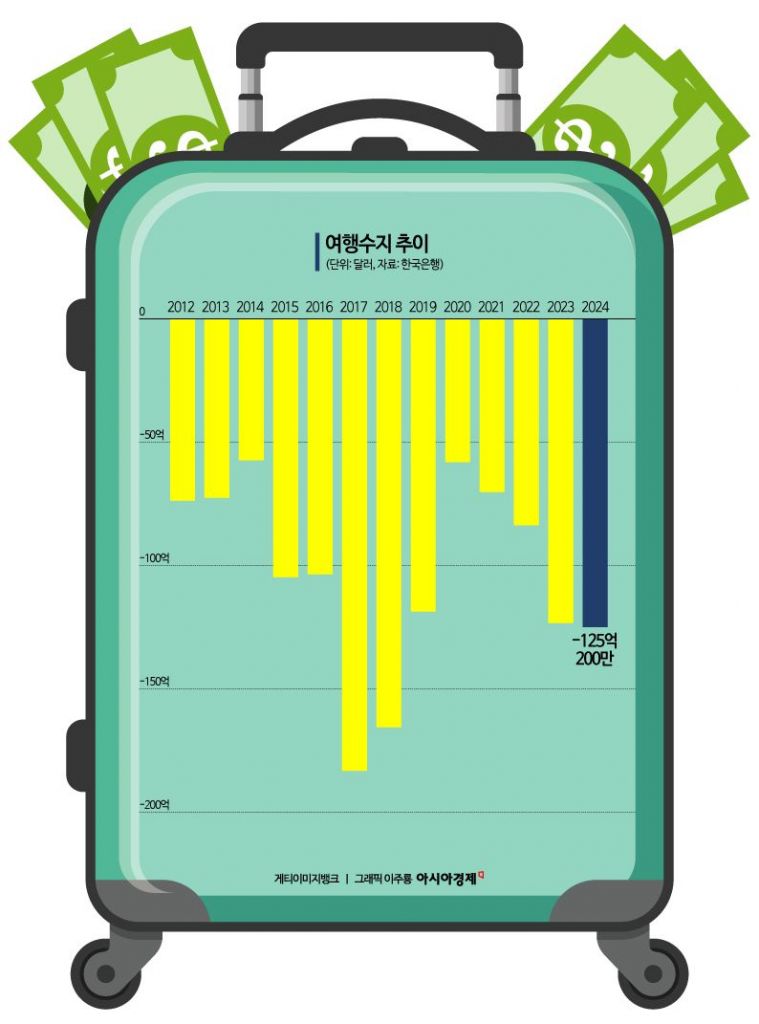 14일 한국은행 경제통계시스템(ECOS)에 따르면 우리나라 여행수지는 2000년 이후 만성 적자 상태다. 연간 여행수지 적자는 증가 추세를 이어오다가 2017년엔 183억2370만달러까지 커졌다. 이후 코로나19로 주춤했다가 하늘길이 열리면서 다시 규모를 키워 지난해 125억200만달러를 기록했다. 2018년(165억6570만달러) 이후 6년 만의 최고치다. 지난해 외국인이 국내에서 쓴 돈을 집계한 여행수입은 167억1660만달러로 전년 152억9430만달러 대비 14억2230만달러(9.30%) 개선됐다. 그러나 이보다 규모가 큰 여행지급이 292억1860만달러로 전년(276억3350만달러)보다 15억8510만달러(5.74%) 늘면서 여행수지 적자 폭이 커졌다.