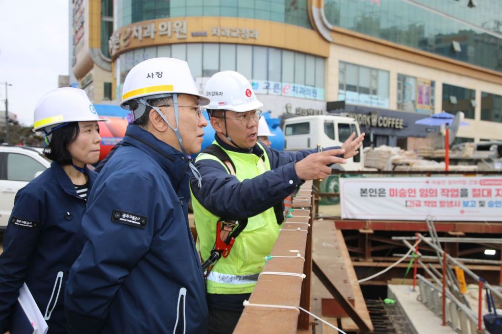 조익문 광주교통공사 사장이 13일 해빙기를 맞아 외부 전문가를 초빙, 차량기지와 2호선 건설 현장 등 취약 시설물을 둘러보고 있다. 광주교통공사 제공