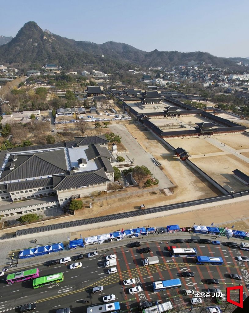 14일 서울 종로구 국립박물관 옆 도로변으로 윤석열 대통령의 탄핵을 촉구하는 더불어민주당, 조국혁신당, 양대노총 등의 천막 농성장이 늘어서 있다.