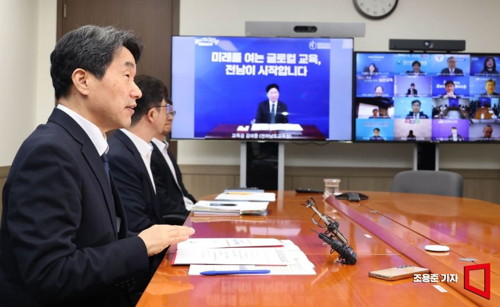 이주호 사회부총리 겸 교육부 장관 14일 서울 종로구 정부서울청사에서 열린 시도교육감 영상간담회에 참석, 초중교 사교육비 조사 관련 발언을 하고 있다.