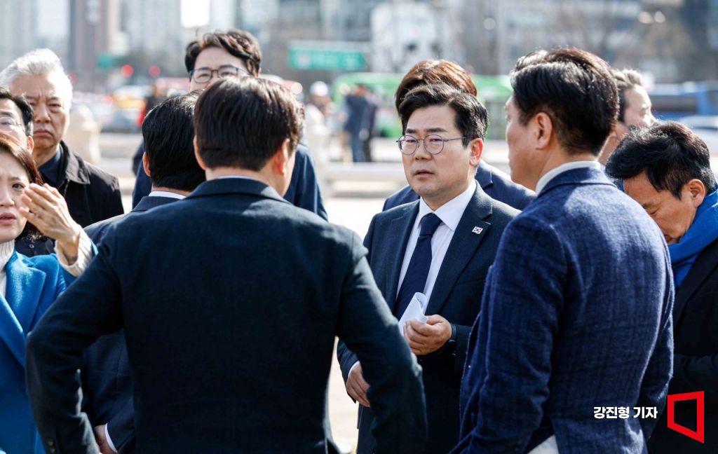 박찬대 더불어민주당 원내대표를 비롯한 최고위원 및 당직자들이 14일 서울 종로구 광화문 앞에서 열린 최고위원회의에 참석해 의견을 나누고 있다.