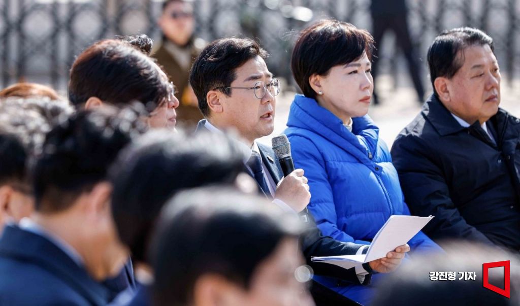 박찬대 더불어민주당 원내대표가 14일 서울 종로구 광화문 앞에서 열린 최고위원회의에 참석해 모두발언 하고 있다.