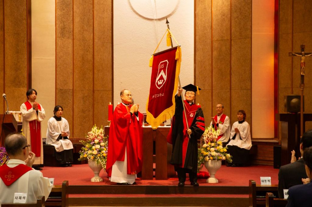 지난 13일 우재명 이사장이 심종혁 총장에게 교기를 전달하고 있다. 서강대학교