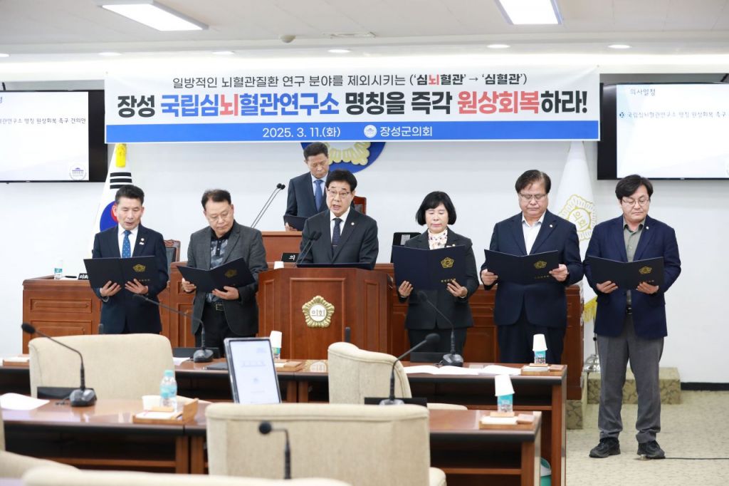 전남 장성군의회가 최근 국립 심뇌혈관연구소 명칭 변경에 반대하며 원래 명칭을 유지할 것을 촉구했다고 14일 밝혔다.