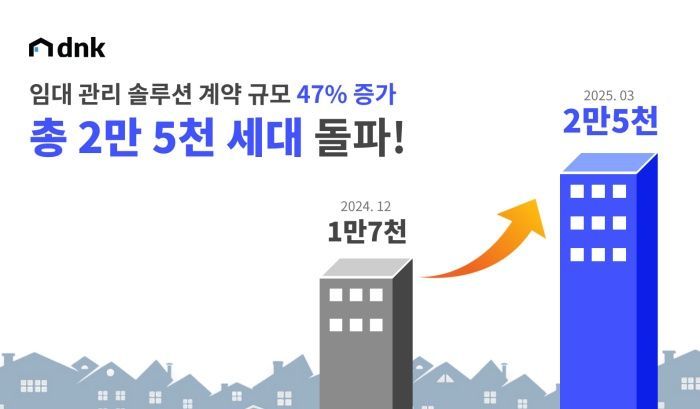 프롭테크 스타트업 DNK는 자사의 ‘주택 임대 관리 솔루션’(PMS) 계약 규모가 지난해 말 대비 47% 증가하여 총 2만 5천 세대를 넘어섰다고 밝혔다.