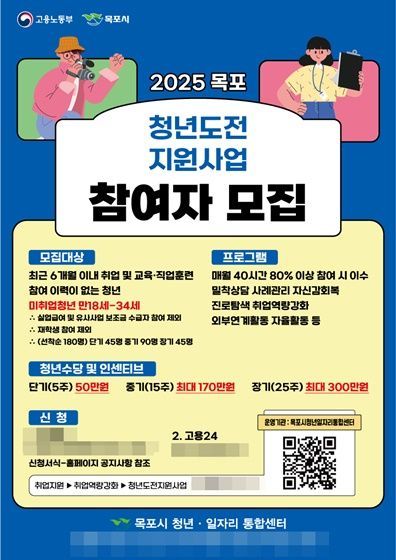 모집은 예산 소진 시까지 선착순으로 진행되며, 신청은 고용24 누리집 또는 목포시 청년·일자리통합센터 이메일로 접수할 수 있다. 자세한 사항은 목포시 청년·일자리통합센터로 문의하면 된다.