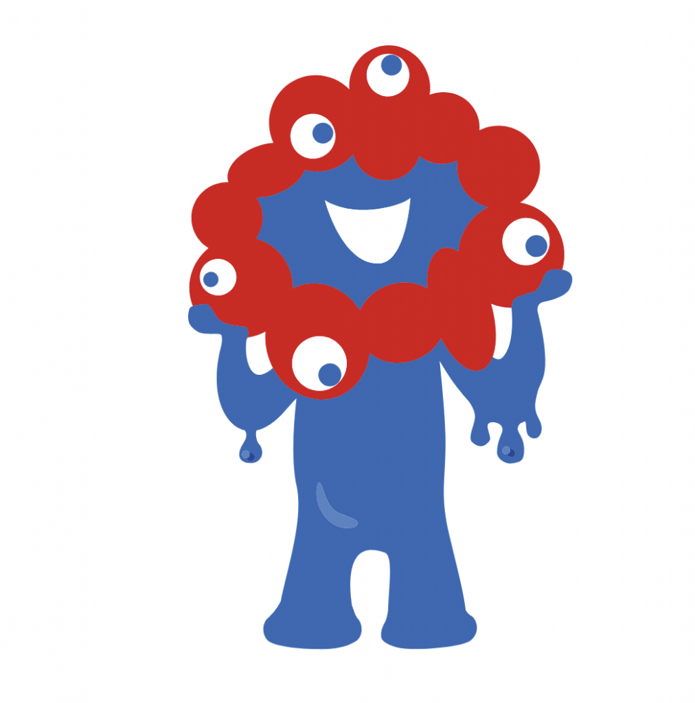 오사카 엑스포 공식 캐릭터 '먀쿠먀쿠'. 세포와 물이 하나가 된 것으로 태어났다는 콘셉트로 붉은 쪽이 세포, 파란 쪽이 물이다. 오사카 엑스포 홈페이지.