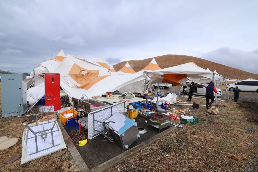 '2025 제주들불축제' 이틀째인 15일 제주시 애월읍 봉성리 새별오름 일대 축제 행사장이 강풍으로 아수라장이 돼 있다. 제주시는 이날 오전 행사 전면 취소를 공지했다. 연합뉴스