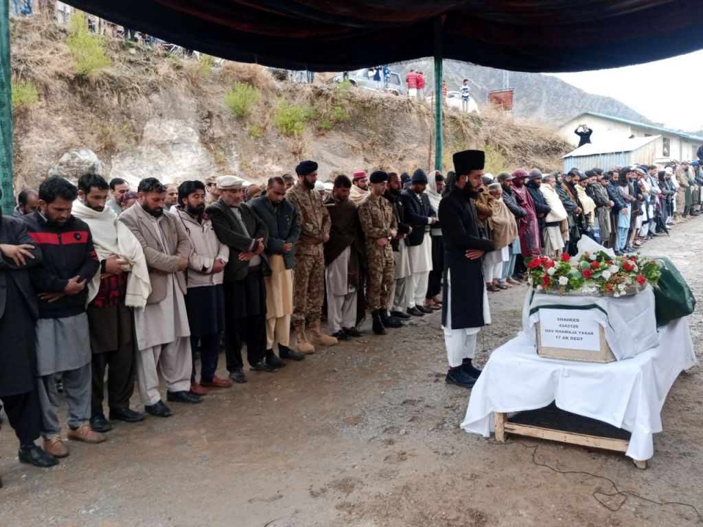지난 14일(현지시간) 파키스탄 북동부 카슈미르에서 발루치스탄주 무장 반군 열차 납치 사건으로 숨진 군인의 장례식이 열리는 모습. EPA·연합뉴스
