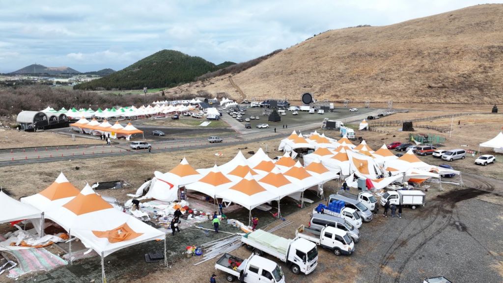 2025 제주들불축제 이틀째인 15일 제주시 애월읍 봉성리 새별오름 일대 행사장이 강풍으로 인해 아수라장이 돼 있다. 연합뉴스