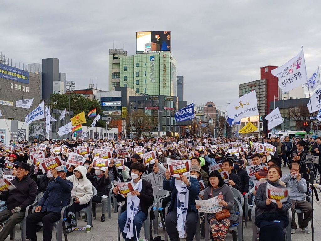 윤석열 즉각 퇴진·사회대개혁 광주비상행동(광주비상행동)은 이날 제18차 광주시민총궐기대회를 열고 탄핵 인용을 요구했다. 주최 측 추산 1천여 명이 참석한 가운데, 참가자들은 ‘내란 우두머리 윤석열 즉각 파면’ 등의 피켓을 들고 “윤석열을 파면하라”는 구호를 외쳤다.