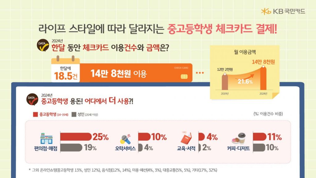 KB국민카드는 16일 새학기 맞이 중고교생 체크카드 결제 데이터 조사 결과를 발표했다. 2019년에서 2024년까지 14~19세 체크카드 이용고객 71만명 결제 데이터 2억6000만건을 분석했다.