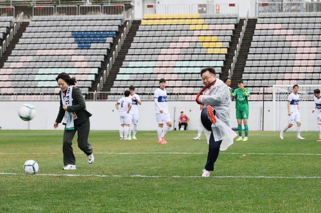 홍남표 창원특례시장이 경기에 앞서 공을 차는 모습.