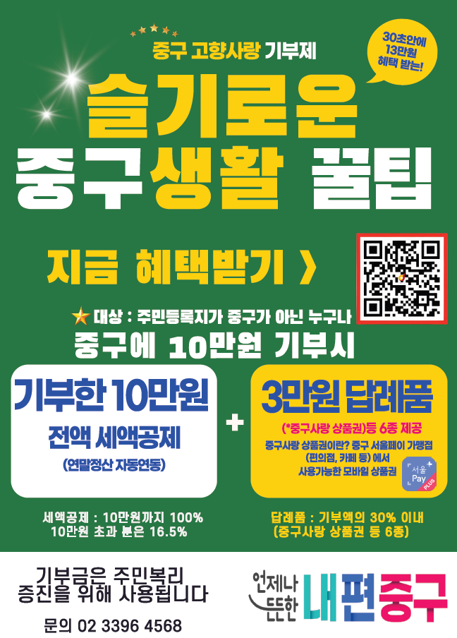 한편, 구는 지난해 관내 기업 직장인, 전통시장 이용자 등을 대상으로 적극적인 대면 홍보를 펼치며 기부금 모금에 앞장섰다. 올해는 기존 답례품에 더해 중구 투어패스 이용권 등을 추가해 차별화된 매력을 선보일 예정이다. 또한 고액 기부자 발굴과 철저한 기부금 관리로 기부제를 더욱 활성화해 나갈 방침이다.