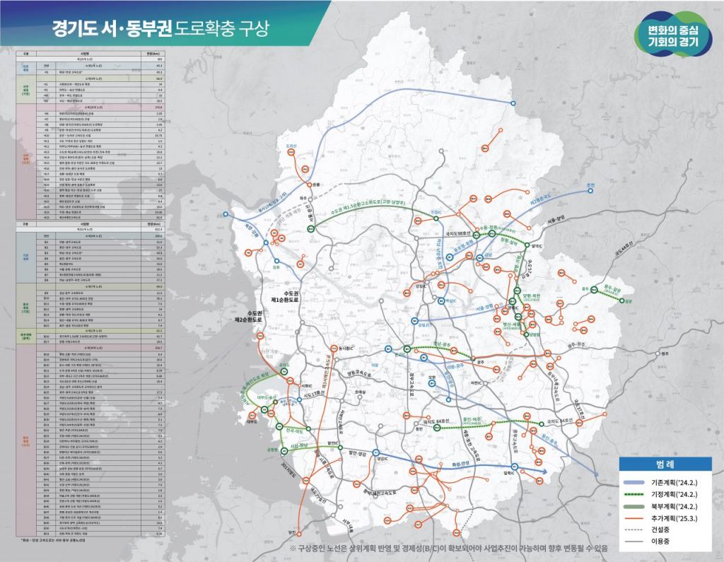 분야별로 보면 도로는 총 76개 노선에 34조1000억원이 투입된다. 주요 사업은 ▲화성~안성 등 고속도로 11개 노선 ▲제2경춘 등 국도 26개 노선 ▲기흥~처인 등 지방도 34개 노선 ▲우정~향남 등 시도 5개 노선 등이다.