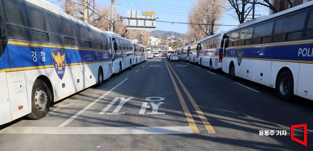 헌법재판소가 윤석열 대통령 탄핵심판 결론을 금주내로 내릴것으로 전망되고 있다. 17일 서울 종로구 헌재 주변으로 경찰 버스가 촘촘히 배치되어 있다.