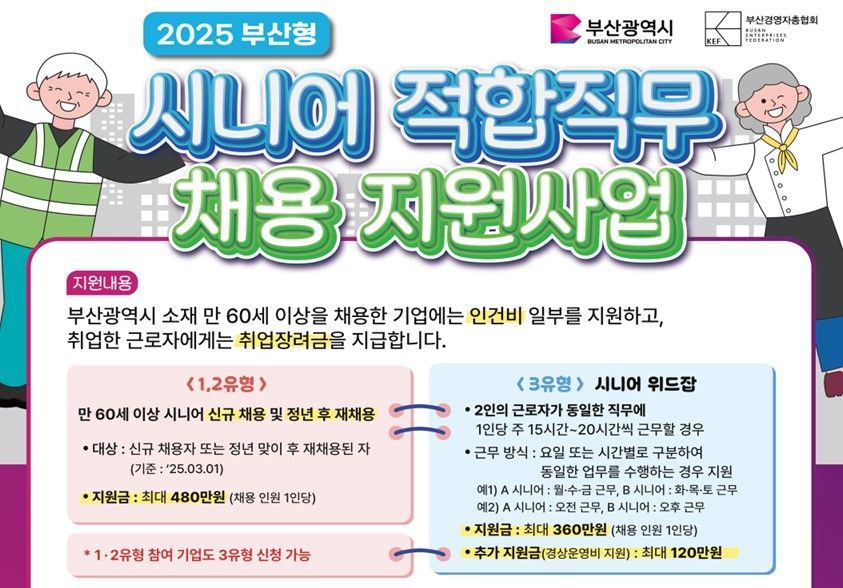 이번 사업은 시가 선정한 ‘부산형 시니어 적합 직무’ 분야에 60세 이상 구직자를 채용할 때 채용 인원 1인당 매월 최대 60만원씩 8개월간 총 480만원의 인건비 일부를 기업에 지원한다.
