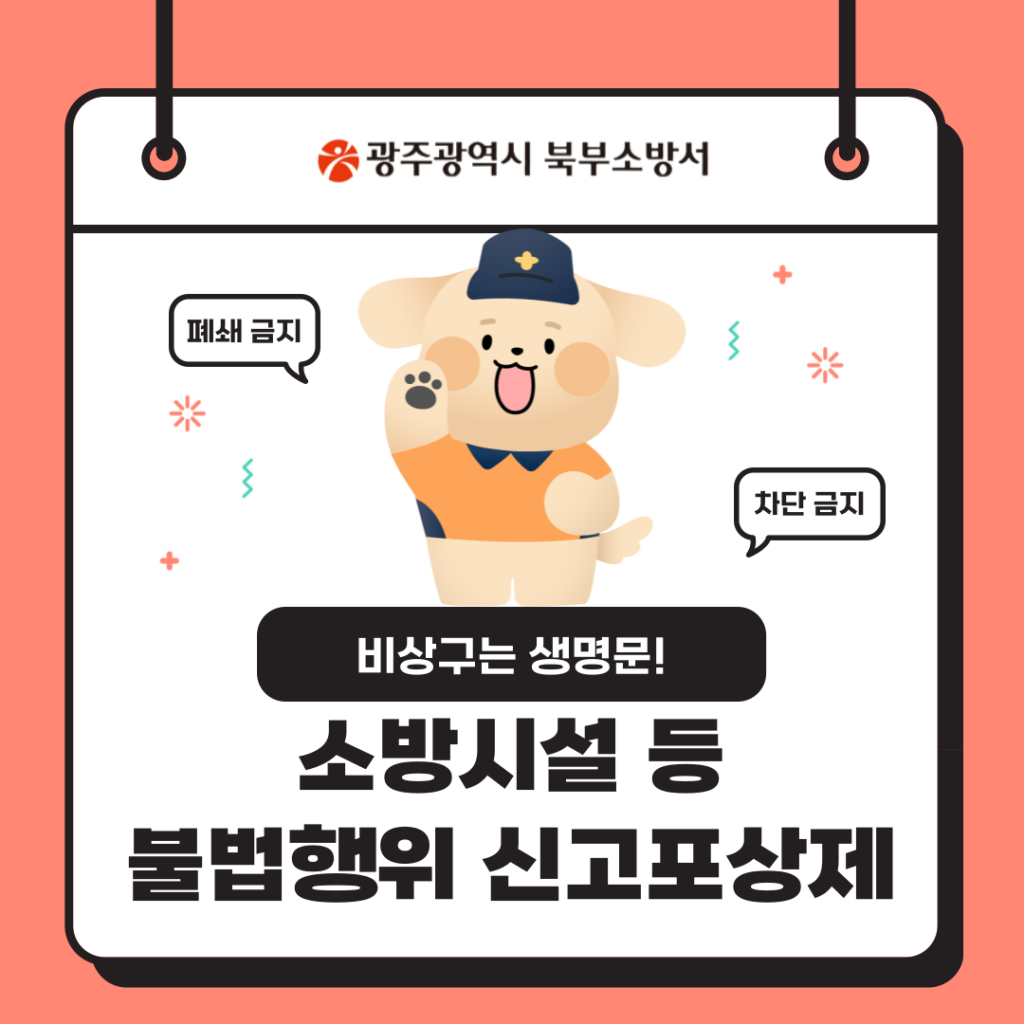 광주 북부소방서가 소방시설 불법행위 근절을 위해 신고포상제를 상시 운영하고 있다고 17일 밝혔다. 불법행위는 소화펌프 고장 방치, 소방시설 차단·폐쇄, 방화문 기능 훼손, 복도·계단·출입구 폐쇄 등이다.
