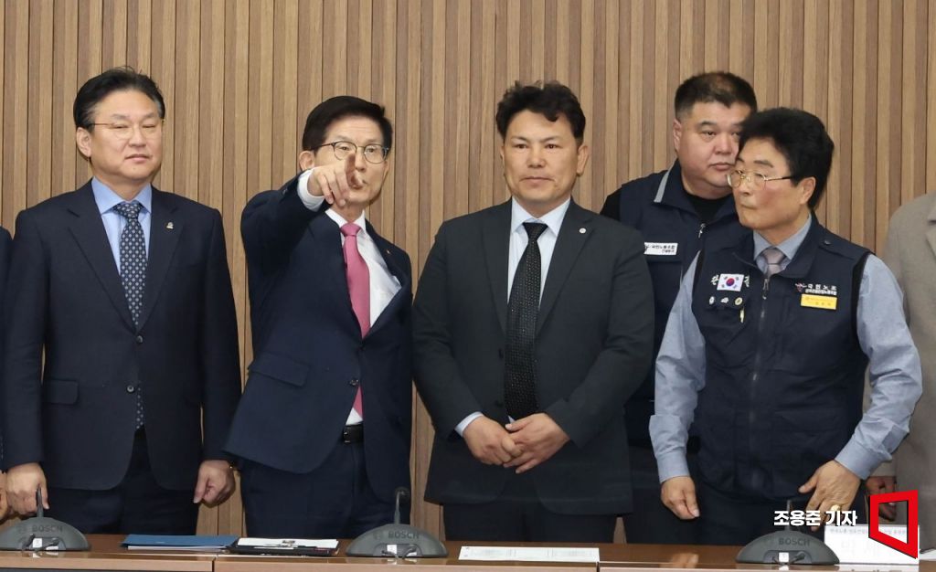 김문수 노동부 장관이 17일 서울 동작구 전문건설회관에서 열린 건설근로자 고용개선을 위한 현장 간담회에 참석, 기념촬영을 위해 근로자들을 앞으로 부르고 있다.