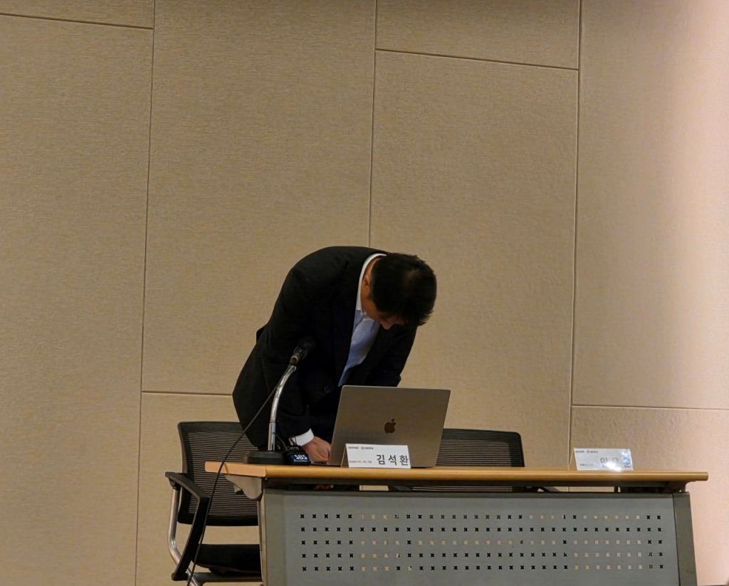 김석환 위믹스 재단 대표가 17일 경기도 성남시 분당구 한컴타워 대강당 열린 위믹스 가상화폐 해킹 피해 관련 긴급 간담회에서 사과하고 있는 모습. 유현석 기자