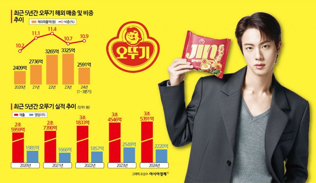 오뚜기가 글로벌 공략에 본격 나섰다. 회사 영문명을 바꾸고 대표 제품인 '진라면'의 글로벌 모델로 방탄소년단(BTS) 진을 발탁해 'K-라면 열풍'에 뒤늦게 올라타겠다는 전략이다. 미국 캘리포니아에 설립을 추진 중인 신규 생산 공장이 가동되기 시작하면 해외 실적을 견인할 것이라는 장미빛 전망이 나온다. 다만 업계에선 인허가 작업이 늦어지고 있는 데다, 히트상품의 경쟁력이 부족하다는 지적도 만만치 않다.