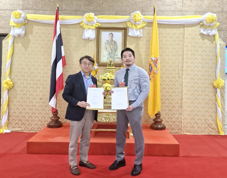 왼쪽부터 강병기 라온로드 부사장과 데니스노 밀리어네리 대표가 태국 국회에서 스마트시티 구축 MOU를 체결하고 기념사진을 찍는 모습. 라온피플 제공.