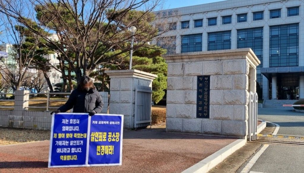 일명 ‘거제 교제폭력 사망사건’의 피해자 유가족이 공소장에 적힌 가해자의 혐의를 ‘상해치사’에서 ‘살인죄’로 변경하라는 1인 시위를 시작했다.