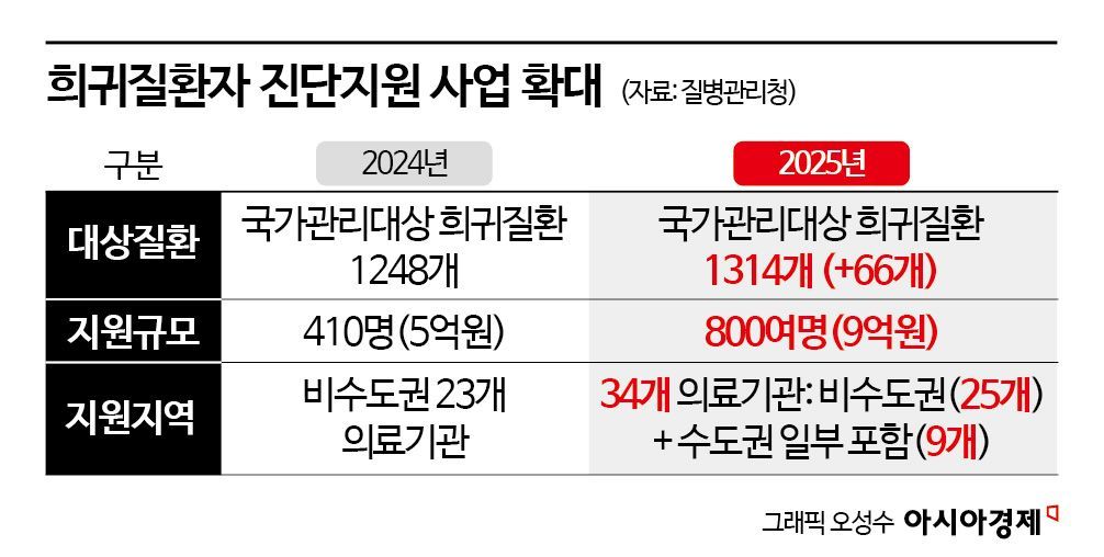 질병청은 올해 진단 지원 대상 질환을 기존 1248개에서 1314개로 66개 늘리는 한편, 진단 실수요 및 희귀질환의 증가 추세 등을 고려해 진단지원 규모를 전년 대비 두 배 늘린 800여명에게 지원하기로 했다. 진단 검사의뢰 지역과 기관도 확대해 기존 비수도권(23개) 의료기관 중심에서 수도권 일부 지역까지 의료기관을 추가, 총 34개 의료기관(비수도권 25개, 수도권 9개)을 통해 거주지 중심의 진단 접근성을 보다 강화할 예정이다.
