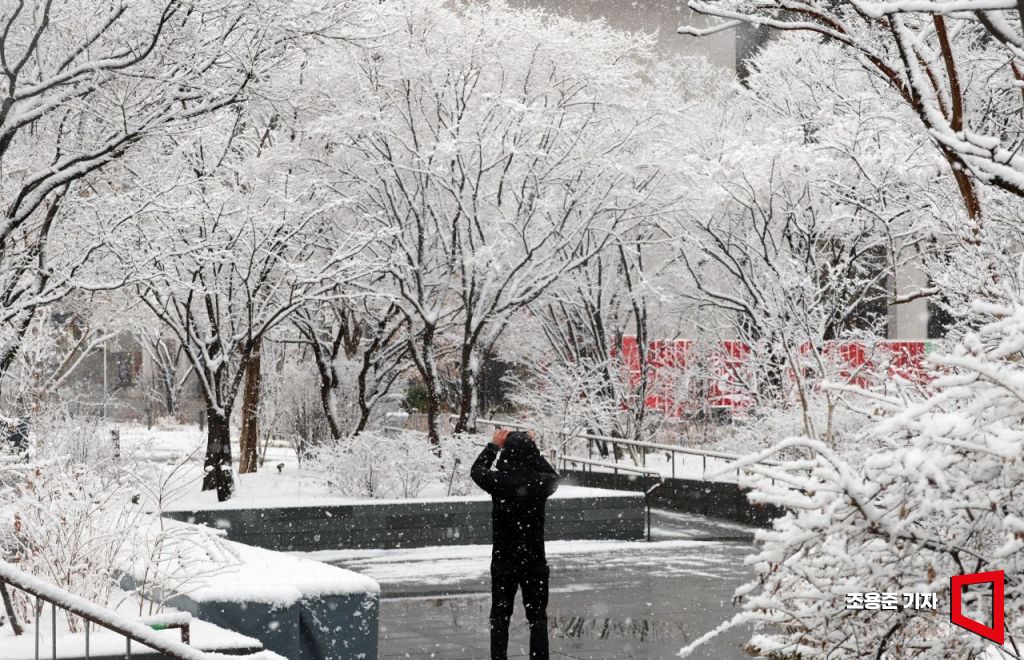 서울에 역대 가장 늦은 대설특보가 발효된 18일 서울 종로 광화문광장 나무에 눈이 쌓이자 출근길 시민이 사진을 찍고 있다.
