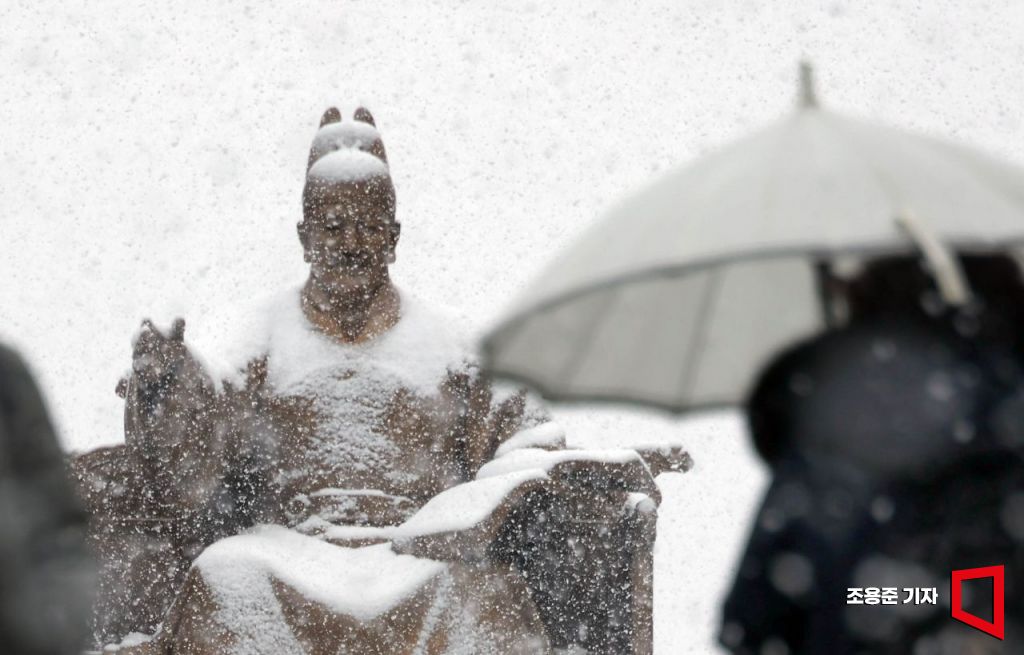 서울 역대 가장 늦은 대설특보가 발효된 18일 서울 종로 광화문광장에서 시민들이 눈을 맞으며 출근길을 서두르고 있다.