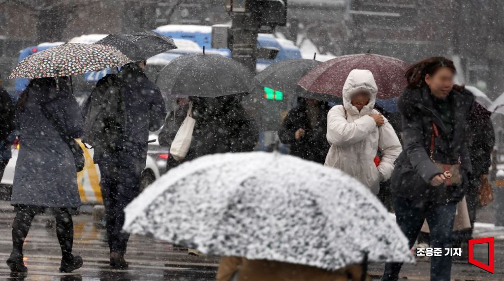 서울 역대 가장 늦은 대설특보가 발효된 18일 서울 종로구 광화문네거리에서 시민들이 눈을 맞으며 출근길을 서두르고 있다.
